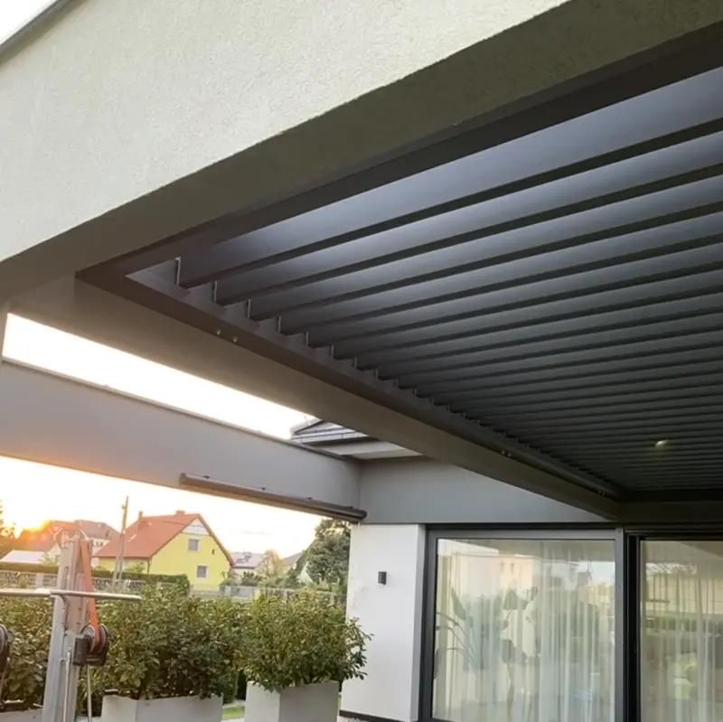 Dzięki temu dach można płynnie ustawiać i zatrzymać w wybranej pozycji, dostosowując warunki na tarasie do aktualnej pogody i pory dnia.