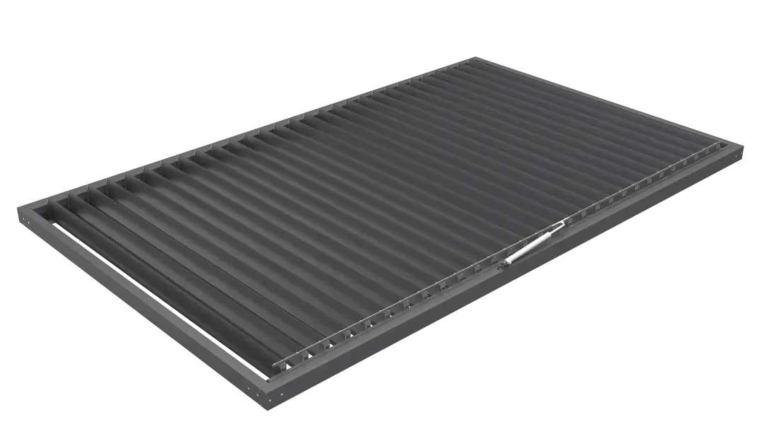 W tym systemie dach tworzą ruchome pióra aluminiowe, które pozwalają sterować ilością światła, cieniem oraz przewiewem nad tarasem. To właśnie praca piór decyduje o tym, jak pergola zachowuje się w codziennym użytkowaniu.